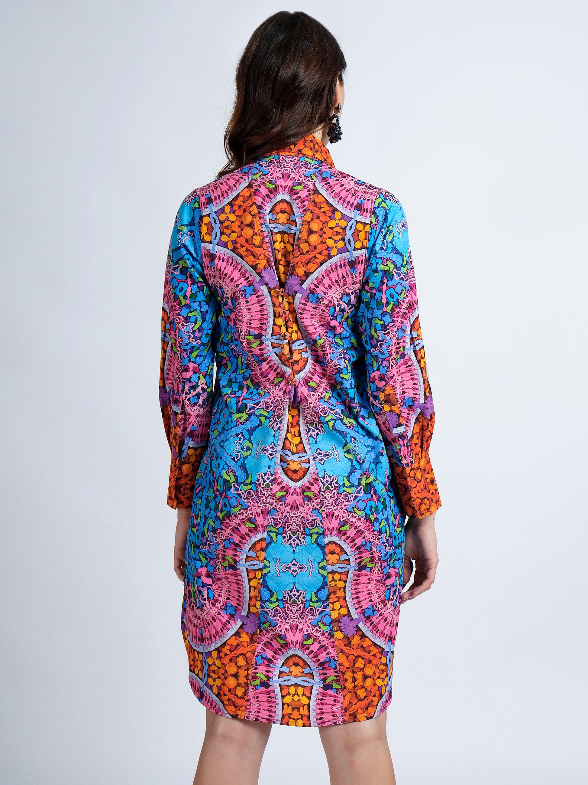 A shirt-style dress with an open front, back hook, and one pocket, crafted in soft cotton poplin.