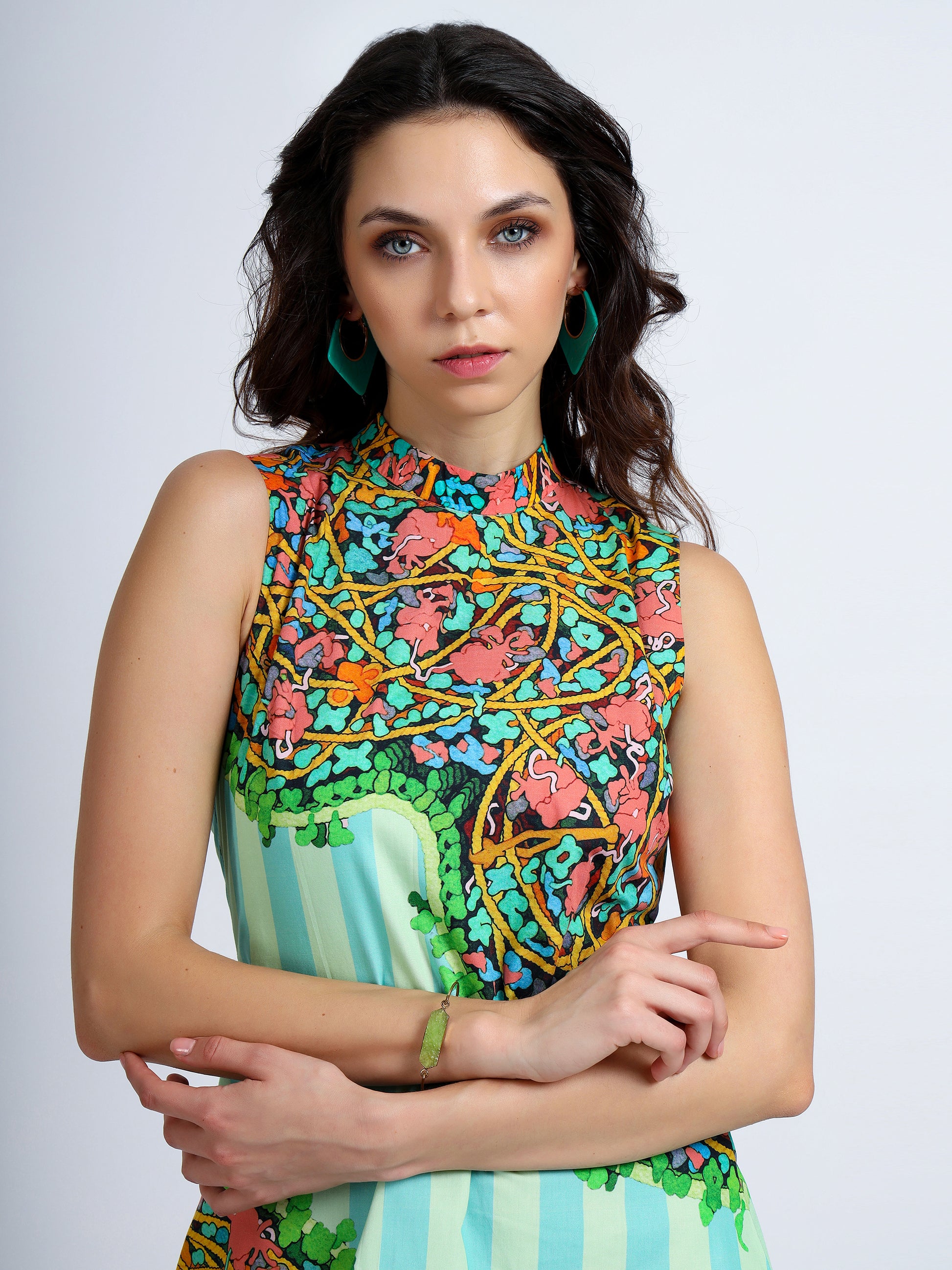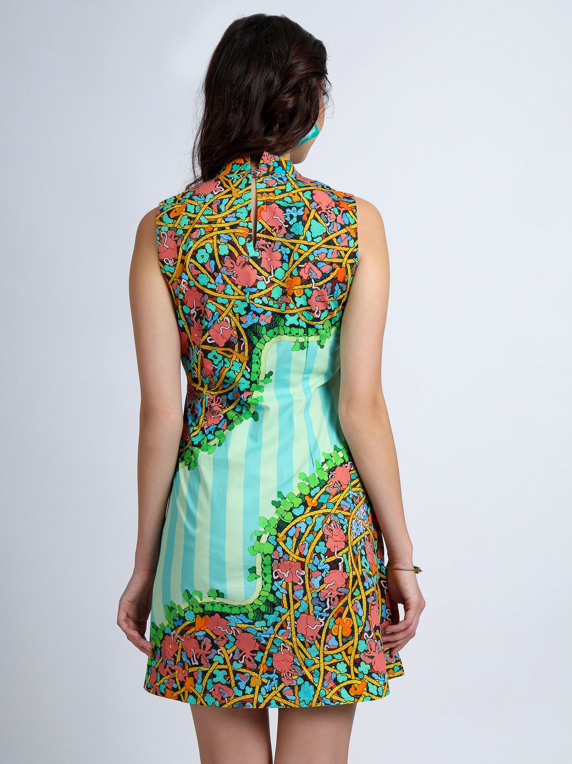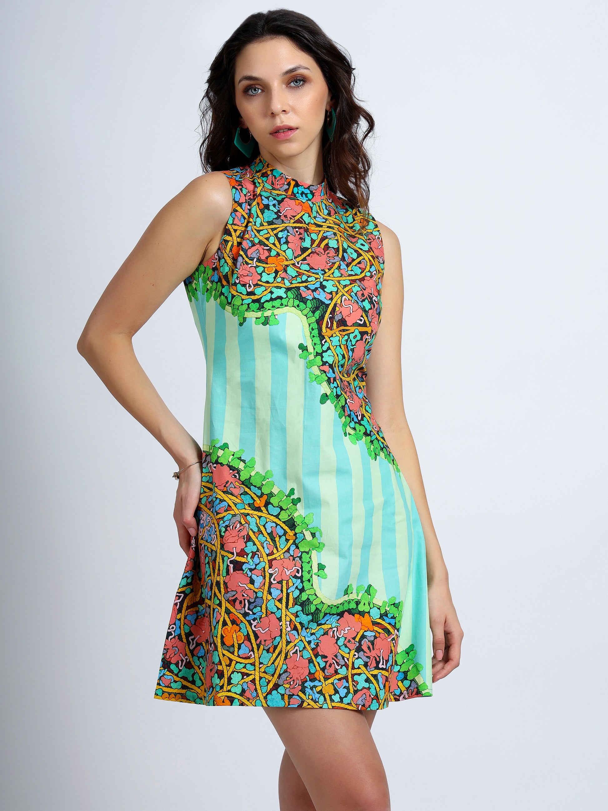 This A-line dress features a high neck and sleeveless cut for a clean, structured silhouette.