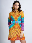 Collared cotton poplin dress with full sleeves, a waist belt, and one pocket.